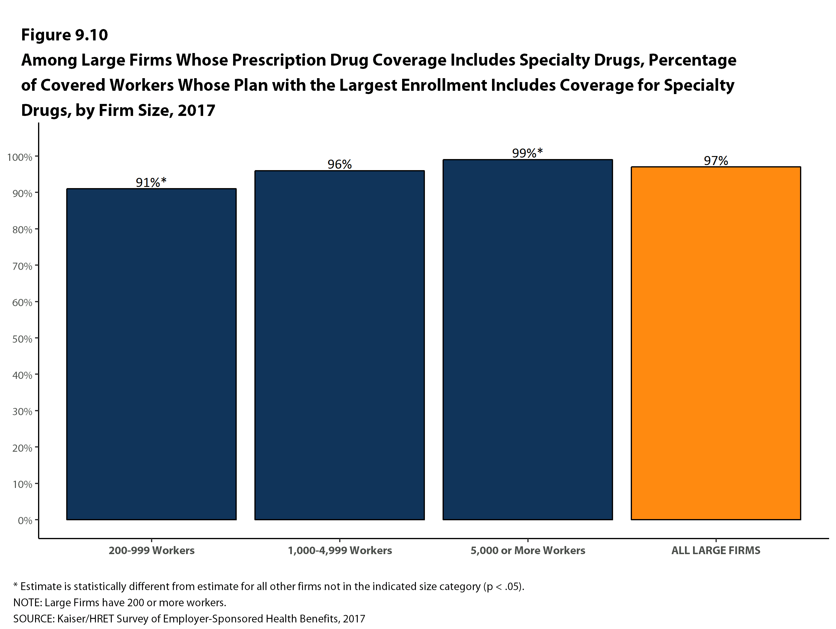 - Specialty drugs: Specialty drugs such as biological drugs are high cost drugs that may be used to treat chronic conditions. Per Exhibit 9.10 from the report, 97% of covered workers at large firms work for employers whose largest health plan provides coverage for specialty drugs.