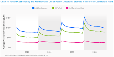 Below is a telling chart from Medicines Use and Spending in the U.S.: A Review of 2016 and Outlook to 2021 by QuintilesIMS (now known as IQVIA). As you can see, consumers' out-of-pocket cost exposure spikes in January. Manufacturer patient assistance and other programs have been offsetting this effect. (See Patient Assistance Programs: Why Pharmaceutical Manufacturers Operate the Biggest U.S. Charities.)