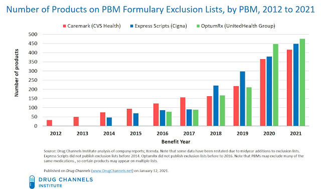 Today, I update our annual tracking of the number of exclusions by each PBM. I also highlight the expansion of exclusions into major specialty therapy classes. The 2021 formulary exclusion lists are available below for your downloading pleasure.